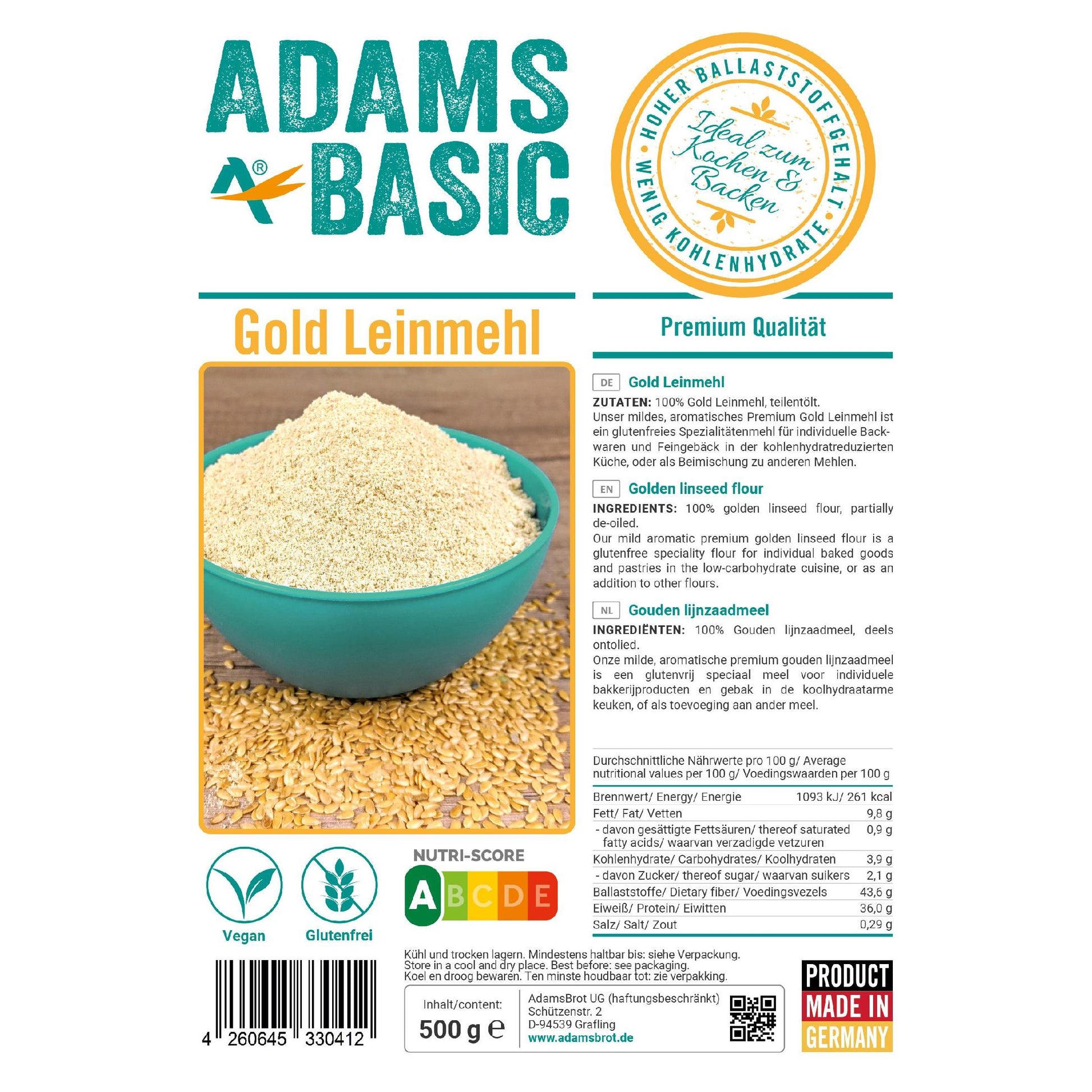 - Adamsbrot Gold Leinmehl wird im Beutel geliefert. Dieser ist luftdicht verschweißt und gewährleistet so eine lange Haltbarkeit und einen frischen Geschmack.